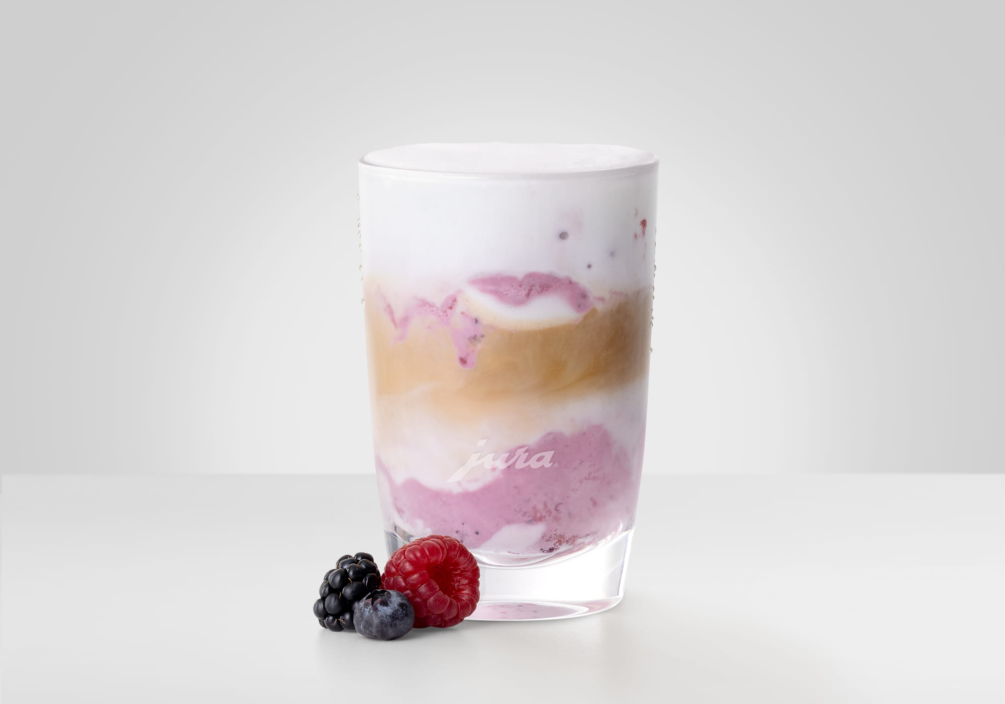 • Mettez deux boules de glace aux fruits des bois dans un petit verre à latte macchiato.